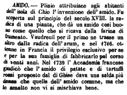 Amido - Plinio attribuisce agli abitanti dell'isola di Chio l'invenzione dell'amido. Fu scoperta sul principio del secolo XVIII. la radica di una pianta, che dà un amido così buono come quello che si ricava dalla farina di frumento. Vaudreuil per il primo ne trasse un altro dalla radica dell'arum, e nel 1716. ottenne in Francia il privilegio esclusivo per se e per la sua famiglia di fabbricarlo pel corso di venti anni. Nel 1739 L'Accademia francese giudicò che l'amido di patate e di tartuffi rossi proposto dal di Ghise dava una salda più densa che quella dell'amido comune, ma che lo smalto non vi si mischiava bene. [immagine]