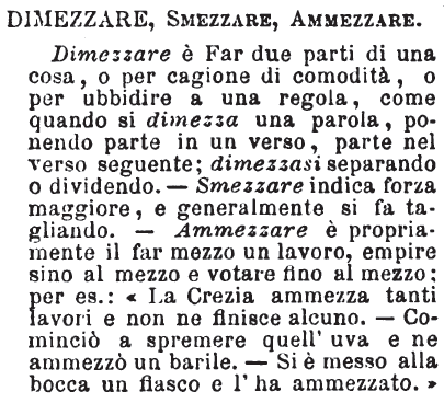 Dimezzare, Smezzare, Ammezzare - Dimezzare è Far due parti di una cosa, o per cagione di comodità, o per ubbidire a una regola, come quando si dimezza una parola, ponendo parte in un verso, parte nel verso seguente; dimezzasi separando o dividendo. - Smezzare indica forza maggiore, e generalmente si fa tagliando. - Ammezzare è propriamente il far mezzo un lavoro, empire sino al mezzo e votare fino al mezzo; per es.: «La Crezia ammezza tanti lavori e non ne finisce alcuno. - Cominciò a spremere quell'uva e ne ammezzò un barile. - Si è messo alla bocca un fiasco e l'ha ammezzato.» [immagine]
