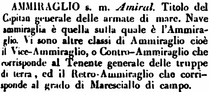 Ammiraglio - Si vuole generalmente far derivare questa voce dall'araba amir o emir, che in quella lingua significa governatore di provincia o generale di armata.