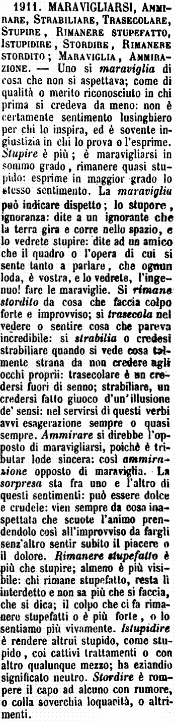 | Maravigliarsi, Ammirare, Strabiliare, Trasecolare, Stupire, Rimanere stupefatto, Istupidire, Stordire, Rimanere stordito; Maraviglia, Ammirazione - Uno si maraviglia di cosa che non si aspettava; come di qualità o merito riconosciuto in chi prima si credeva da meno: non è certamente sentimento lusinghiero per chi lo inspira, ed è sovente ingiustizia in chi lo prova o l'esprime. Stupire è più; è maravigliarsi in sommo grado, rimanere quasi stupido: esprime in maggior grado lo stesso sentimento. La maraviglia può indicare dispetto; lo stupore, ignoranza: dite a un ignorante che la terra gira e corre nello spazio, e lo vedrete stupire: dite ad un amico che il quadro o l'opera di cui si sente tanto a parlare, che ognun loda, è vostra, e lo vedrete, l'ingenuo! fare le maraviglie. Si rimane stordito da cosa che faccia colpo forte e improvviso; si trasecola nel vedere o sentire cosa che pareva incredibile: si strabilia o credesi strabiliare quando si vede cosa talmente strana da non credere agli occhi proprii: trasecolare è un credersi fuori di senno; strabiliare, un credersi fatto giuoco d'un'illusione de' sensi: nel servirsi di questi verbi avvi esagerazione sempre o quasi sempre. Ammirare si direbbe l'opposto di maravigliarsi, poichè è tributar lode sincera: così ammirazione opposto di maraviglia. La sorpresa sta fra uno e l'altro di questi sentimenti: può essere dolce e crudele: vien sempre da cosa inaspettata che scuote l'animo prendendolo così all'improvviso da fargli senz'altro sentir subito il piacere o il dolore. Rimanere stupefatto è più che stupire; almeno è più visibile: chi rimane stupefatto, resta lì interdetto e non sa più che si faccia, che si dica; il colpo che ci fa rimanere stupefatti o è più forte, o lo sentiamo più vivamente. Istupidire è rendere altrui stupido, come stupido, coi cattivi trattamenti o con altro qualunque mezzo; ha eziandio significato neutro. Stordire è rompere il capo ad alcuno con rumore, o colla soverchia loquacità, o altrimenti. [immagine] |
