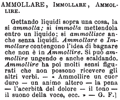 Ammollare, Immollare, Ammollire - Gettando liquidi sopra una cosa, la si ammolla; si immolla mettendola entro un liquido; si ammollisce anche senza liquidi. Ammollare e Immollare contengono l'idea di bagnare che non è in Ammollire. Si può ammollire ungendo e anche scaldando. Ammollire ha poi molti sensi figurati che non possono ricevere gli altri verbi. - «Ammollire un cuor duro - un animo altero - la pena - l'acerbità del dolore - il tono - il suono della voce, ecc.» - G. F.] [immagine]