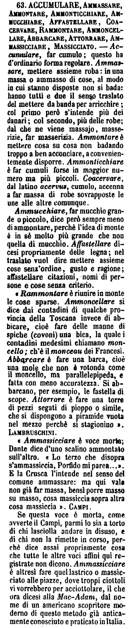 Ammucchiare, far mucchio grande o piccolo, dice però sempre meno di ammontare, perchè l'idea di monte è in sè molto più grande che non quella di mucchio. Affastellare dicesi propriamente delle legna; nel traslato vuol dire mettere assieme cose senz'ordine, gusto e ragione; affastellare citazioni, nomi di persone e cose senza criterio. «Rammontare è riunire in monte le cose sparse. Ammoncellare si dice dai contadini di qualche provincia della Toscana invece di abbicare, cioè fare delle manne di spiche (covoni) una bica, la quale i contadini medesimi chiamano moncello; ch'è il monceau dei Francesi. Abbarcare è fare una barca, cioè una mole che non è rotonda come il moncello, ma parallelepipeda, e fatta con meno accuratezza. Si abbarcano, per esempio, le fastella di scope. Attorrare è fare una torre di pezzi segati di pioppo o simile, che si dispongono a piramide vuota nel mezzo perchè si stagionino». Lambruschini. «Ammassicciare è voce morta; Dante dice d'uno scalino ammontato sull'altro. «Lo terzo che disopra s'ammassiccia, Porfido mi parea...». E la Crusca l'intende nel senso del comune ammassare: ma qui vale non già far massa, bensì porre masso su masso, cosa massiccia sopra altra cosa massiccia». Campi. Se questa voce è morta, come avverte il Campi, parmi lo sia a torto di chi lasciolla andare in disuso, e di chi non la rimette in corso, perchè dice assai propriamente cosa che tutte le altre voci affini qui registrate non dicono. Ammassicciare è altresì fare quel lastrico o massicciato alle piazze, dove troppi ciottoli vi vorrebbero per acciottolare, il che ora dicesi alla Mac-Adam, dal nome di un americano scopritore moderno di questo metodo già anticamente conosciuto e praticato in Italia. [immagine] |