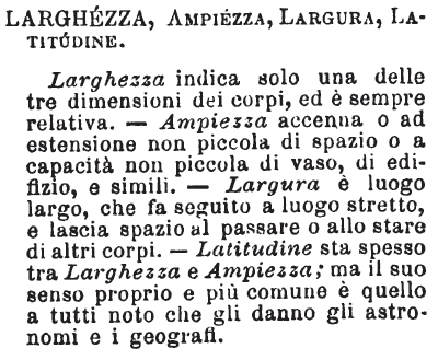 Larghezza, Ampiezza, Largura, Latitudine - Larghezza indica solo una delle tre dimensioni dei corpi, ed è sempre relativa. - Ampiezza accenna o ad estenzione non piccola di spazio o a capacità non piccola di vaso, di edifizio, e simili. - Largura è luogo largo, che fa seguito a luogo stretto, e lascia spazio al passare o allo stare di altri corpi. - Latitudine sta spesso tra Larghezza e Ampiezza; ma il suo senso proprio e più comune è quello a tutti noto che gli danno gli astronomi e i geografi. [immagine]