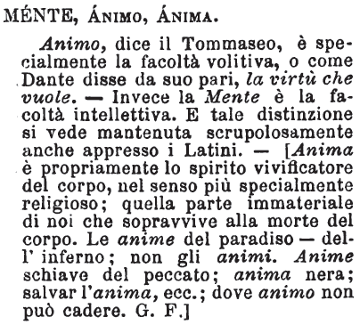 Mente, Animo, Anima - Animo, dice il Tommaseo, è specialmente la facoltà volitiva, o come Dante disse da suo pari, la virtù che vuole. - Invece la Mente è la facoltà intelletiva. E tale distinzione si vede mantenuta scrupolosamente anche appresso i Latini. - [Anima è propriamente lo spirito vivificatore del corpo; nel senso più specialmente religioso; quella parte immateriale di noi che sopravvive alla morte del corpo. Le anime del paradiso - dell'inferno; non gli animi. Anime schiave del peccato; anima nera; salvar l'anima, ecc.; dove animo non può cadere. G. F.] [immagine]