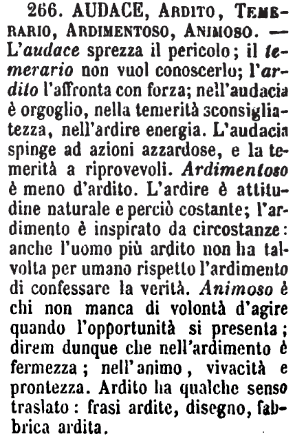 | Audace, Ardito, Temerario, Ardimentoso, Animoso - L'audace sprezza il pericolo; il temerario non vuol conoscerlo; l'ardito l'affronta con forza; nell'audacia è orgoglio, nella temerità sconsigliatezza, nell'ardire energia. L'audacia spinge ad azioni azzardose, e la temerità a riprovevoli. Ardimentoso è meno d'ardito. L'ardire è attitudine naturale e perciò costante; l'ardimento è inspirato da circostanze: anche l'uomo più ardito non ha talvolta per umano rispetto l'ardimento di confessare la verità. Animoso è chi non manca di volontà d'agire quando l'opportunità si presenta; direm dunque che nell'ardimento è fermezza; nell'animo, vivacità e prontezza. Ardito ha qualche senso traslato: frasi ardite, disegno, fabbrica ardita. [immagine] |