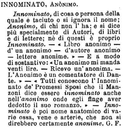 | Innominato, Anonimo - Innominato, di cosa o persona della quale è taciuto o si ignora il nome; Anonimo, di chi non l'ha; e si dice più specialmente di Autori, di libri e di lettere; nè di questi è proprio Innominato. - «Libro anonimo - d'un anonimo - d'autore anonimo - lettere anonime.» - E a modo di sostantivo: «Un anonimo mi manda venti lire. - Ricevo un'anonima. - L'Anonimo è un commentatore di Dante.» - «Tutti conoscono l'Innominato de' Promessi Sposi che il Manzoni dice essere innominato anche nell'anonimo onde egli finge aver dedotto il suo romanzo.» - Innominato è poi nome anatomico di varie ossa, vene e arterie, che non si direbbero certamente anonime. G. F. [immagine] |