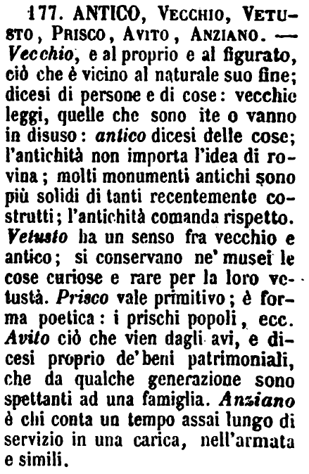 | Antico, Vecchio, Vetusto, Prisco, Avito, Anziano - Vecchio, e al proprio e al figurato, ciò che è vicino al naturale suo fine; dicesi di persone e di cose: vecchie leggi, quelle che sono ite o vanno in disuso: antico dicesi delle cose; l'antichità non importa l'idea di rovina; molti monumenti antichi sono più solidi di tanti recentemente costrutti; l'antichità comanda rispetto. Vetusto ha un senso fre vecchio e antico; si conservano ne' musei le cose curiose e rare per la loro vetustà. Prisco vale primitivo; è forma poetica: i prischi popoli, ecc. Avito ciò che vien dagli avi, e dicesi proprio de' beni patrimoniali, che da qualche generazione sono spettanti ad una famiglia. Anziano è chi conta un tempo assai lungo di servizio in una carica, nell'armata e simili. [immagine] |