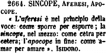 | Apocope - Figura per cui si tronca una lettera, o una sillaba in fine d'una parola (V. Sincope, Aferesi, Troncamento). [immagine] |