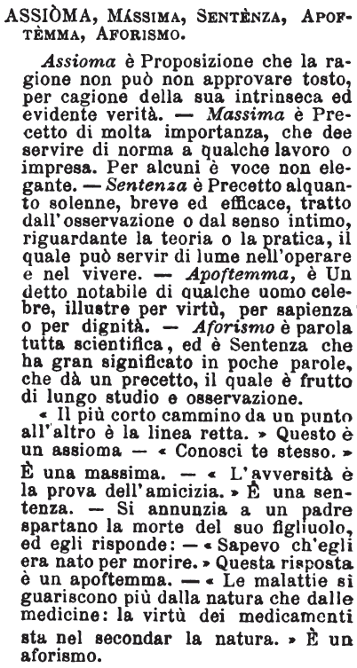 | Assioma, Massima, Sentenza, Apoftemma, Aforismo - Assioma è Proposizione che la ragione non può non approvare tosto, per cagione della sua intrinseca ed evidente verità. - Massima è Precetto di molta importanza, che dee servire di norma a qualche lavoro o impresa. Per alcuni è voce non elegante. - Sentenza è Precetto alquanto solenne, breve ed efficace, tratto dall'osservazione o dal senso intimo, riguardante la teoria o la pratica, il quale può servir di lume nell'operare e nel vivere. - Apoftemma, è Un detto notabile di qualche uomo celebre, illustre per virtù, per sapienza o per dignità. - Aforismo è parola tutta scientifica, ed è Sentenza che ha gran significato in poche parole, che dà un precetto il quale è frutto di lungo studio e osservazione.