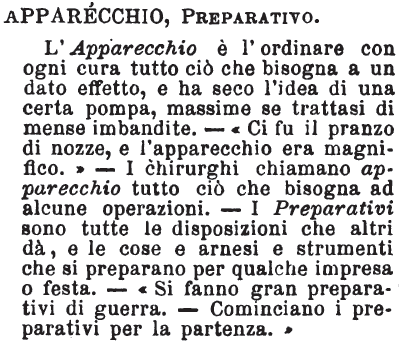 Apparecchio, Preparativo - L'Apparecchio è l'ordinare con ogni cura tutto ciò che bisogna a un dato effetto, e ha seco l'idea di una certa pompa, massime se trattasi di mense imbandite. - «Ci fu il pranzo di nozze, e l'apparecchio era magnifico.» - I chirurghi chiamano apparecchio tutto ciò che bisogna ad alcune operazioni. - I Preparativi sono tutte le disposizioni che altri dà, e le cose e arnesi e strumenti che si preparano per qualche impresa o festa. - «Si fanno gran preparativi di guerra. - Cominciano i preparativi per la partenza.» [immagine]