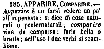 Apparire, Comparire - Apparire è un farsi vedere un po' all'impensata: si dice di cose naturali o preternaturali; comparire vien da comparsa: farla bella o brutta; nell'uso i due verbi si scambiano. [immagine]