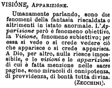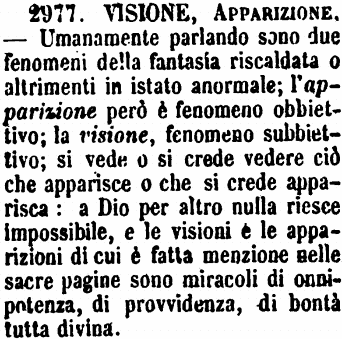 Visione, Apparizione - Umanamente parlando sono due fenomeni della fantasia riscaldata o altrimenti in istato anormale; l'apparizione però è fenomeno obbiettivo; la visione, fenomeno subiettivo; si vede o si crede vedere ciò che apparisce o che si crede apparisca: a Dio per altro nulla riesce impossibile, e le visioni e le apparizioni di cui è fatta menzione nelle sacre pagine sono miracoli di onnipotenza, di provvidenza, di bontà tutta divina. [immagine]