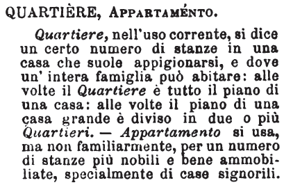 | Quartiere, Appartamento - Quartiere, nell'uso corrente, si dice un certo numero di stanze in una casa che suole appigionarsi, e dove un'intera famiglia può abitare: alle volte il Quartiere è tutto il piano di una casa: alle volte il piano di una casa grande è diviso in due o più Quartieri. - Appartamento si usa, ma non familiarmente, per un numero di stanze più nobili e bene ammobiliate, specialmente di case signorili. [immagine] |