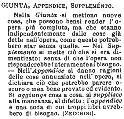 | Giunta, Appendice, Supplemento - Nella Giunta si mettono nuove cose, che possono bensì render l'opera più compiuta, ma che stanno indipendentemente dalle cose già dette nell'opera, come queste potrebbero star senza quelle. - Nel Supplemento si mette ciò che si era dimenticato; senza di che l'opera non risponderebbe interamente al bisogno. - Nell'Appendice si danno ragioni delle cose annunziate nell'opera, si dichiara ciò che potrebbe parere oscuro o men bene provato ed evidente. Si aggiunge cosa a cosa, si supplisce alla mancanza, al difetto: l'appendice è una coda di cui troppi libri avrebbero di bisogno. (Zecchini). [immagine] |