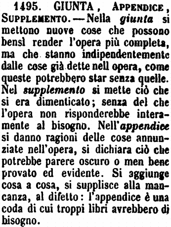 | Giunta, Appendice, Supplemento - Nella giunta si mettono nuove cose che possono bensì render l'opera più completa, ma che stanno indipendentemente dalle cose già dette nell'opera, come queste potrebbero star senza quelle. Nel supplemento si mette ciò che si era dimenticato; senza del che l'opera non risponderebbe interamente al bisogno. Nell'appendice si danno ragioni delle cose annunziate nell'opera, si dichiara ciò che potrebbe parere oscuro o men bene provato ed evidente. Si aggiunge cosa a cosa, si supplisce alla mancanza, al difetto: l'appendice è una coda di cui troppi libri avrebbero di bisogno. [immagine] |