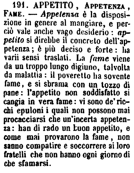 Appetito, Appetenza, Fame - Appetenza è la disposizione in genere al mangiare, e perciò vale anche vago desiderio: appetito si direbbe il concreto dell'appetenza; è più deciso e forte: ha varii sensi traslati. La fame viene da un troppo lungo digiuno, talvolta da malattia: il poveretto ha sovente fame, e si sbrama con un tozzo di pane: l'appetito non soddisfatto si cangia in vera fame: vi sono de' ricchi epuloni i quali non possono mai procacciarsi che un'incerta appetenza: han di rado un buon appetito, e come mai provarono la fame, non sanno compatire e soccorrere ai loro fratelli che non hanno ogni giorno di che sfamarsi. [immagine]