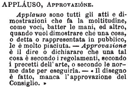 | Applauso, Approvazione - Applauso sono tutti gli atti e dimostrazioni che fa la moltitudine, come voci, batter le mani, ed altro, quando vuol dimostrare che una cosa, o detta o rappresentata in pubblico, le è molto piaciuta. - Approvazione è il dire o dichiarare che una tal cosa è secondo i regolamenti, secondo i precetti dell'arte, o secondo le norme date per eseguirla.- «Il disegno è fatto, manca l'approvazione del Consiglio.» [immagine] |
