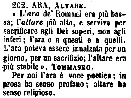 Per noi l'ara è voce poetica; in prosa ha senso profano; altare ha senso religioso. [immagine] |