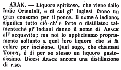 Arak - Liquore spiritoso, che viene dalle Indie Orientali, e di cui gl'Inglesi fanno un gran consumo per il ponce. Il nome è indiano; significa tutto ciò ch'è forte o distillato: talmentechè gl'Indiani danno il nome di Arack all'acquavite; ma noi lo applichiamo propriamente soltanto a quel loro liquore che si fa colare per incisione. Quel sugo, che chiamasi Toddy, è di per se stesso un liquore gustosissimo. Dicesi Arack ancora una distillazione di riso. [immagine]