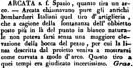 | Arcata - s. f. Spazio, quanto tira un arco. - Arcata chiamavano pure gli antichi bombardieri Italiani quel tiro d'artiglieria, che a cagione della lontananza dell'obbietto posto più in là del punto in bianco naturale non poteva farsi senza una maggiore elevazione della bocca del pezzo, per cui la linea descritta dal proietto veniva a mostrarsi come curvata a modo d'arco. Questo tiro a quei tempi era giudicato incertissimo. Gras. [immagine] |
