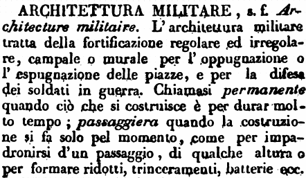 Architettura militare - s. f. Architecture militaire. L'architettura militare tratta della fortificazione regolare ed irregolare, campale o murale per l'oppugnazione o l'espugnazione delle piazze, e per la difesa dei soldati in guerra. Chiamasi permanente quando ciò che si costruisce è per durar molto tempo; passaggiera quando la costruzione si fa solo pel momento, come per impadronirsi d'un passaggio, di qualche altura o per formare ridotti, trinceramenti, batterie ecc. [immagine]
