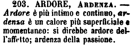 | Ardore, Ardenza - Ardore è più intimo e continuo, ardenza è un calore più superficiale e momentaneo: si direbbe ardore dell'affetto; ardenza della passione. [immagine] |