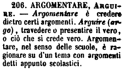 Argomentare, Arguire - Argomentare è credere dietro certi argomenti. Arguire (argo), travedere o presentire il vero, o ciò che si crede vero. Argomentare, nel senso delle scuole, è ragionare su d'un tema con argomenti detti appunto scolastici. [immagine]