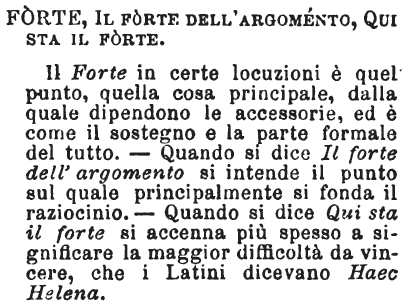 Forte, Il forte dell’argomento, Qui sta il forte - Il Forte in certe locuzioni è quel punto, quella cosa principale, dalla quale dipendono le accessorie, ed è come il sostegno e la parte formale del tutto. - Quando si dice Il forte dell'argomento si intende il punto sul quale principalmente si fonda il raziocinio. - Quando si dice Qui sta il forte si accenna più spesso a significare la maggior difficoltà da vincere, che i Latini dicevano Haec Helena. [immagine]