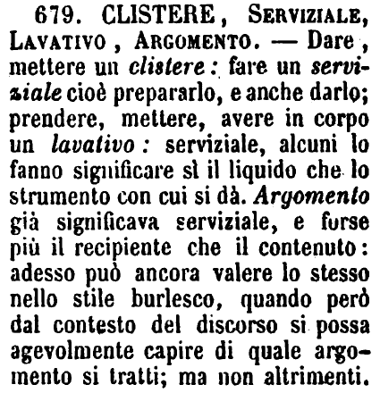 Clistere, Serviziale, Lavativo, Argomento - Dare, mettere un clistere: fare un serviziale cioè prepararlo, e anche darlo; prendere, mettere, avere in corpo un lavativo: serviziale, alcuni lo fanno significare sì il liquido che lo strumento con cui si dà. Argomento già significava serviziale, e forse più il recipiente che il contenuto: adesso può ancora valere lo stesso nello stile burlesco, quando però dal contesto del discorso si possa agevolmente capire di quale argomento si tratti; ma non altrimenti. [immagine]