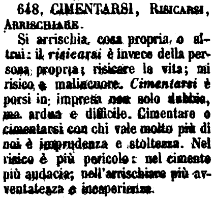 | Cimentarsi, Risicarsi, Arrischiare - Si arrischia cosa propria, o altrui: il risicarsi è invece della persona propria; risicare la vita; mi risico a malincuore. Cimentarsi è porsi in impresa non solo dubbia, ma ardua e difficile. Cimentare o cimentarsi con chi vale molto più di noi è imprudenza e stoltezza. Nel risico è più pericolo: nel cimento più audacia; nell'arrischiare più avventatezza e inesperienza. [immagine] |