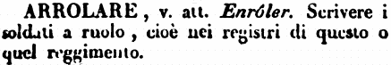 Arrolare - v. att. Enróler. Scrivere i soldati a ruolo, cioè nei registri di questo o quel reggimento. [immagine]