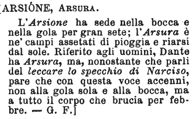 | Arsione, Arsura - L'Arsione ha sede nella bocca e nella gola per gran sete; l'Arsura è ne' campi assetati di pioggia e riarsi dal sole. Riferito agli uomini, Dante ha Arsura, ma, nonostante che parli del leccare lo specchio di Narciso, pare che con questa voce accenni, non alla gola sola e alla bocca, ma a tutto il corpo che brucia per febbre. - G. F.] [immagine] |