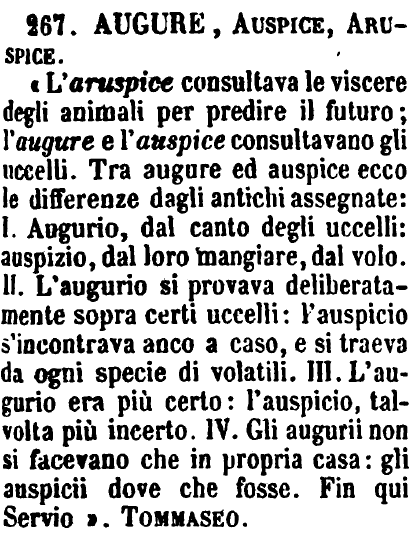 | Augure, Auspice, Aruspice - «L'aruspice consultava le viscere degli animali per predire il futuro; l'augure e l'auspice consultavano gli uccelli. Tra augure ed auspice ecco le differenze dagli antichi assegnate: I. Augurio, dal canto degli uccelli: auspizio, dal loro mangiare, dal volo. II. L'augurio si provava deliberatamente sopra certi uccelli: l'auspicio s'incontrava anco a caso, e si traeva da ogni specie di volatili. III. L'augurio era più certo: l'auspicio, talvolta più incerto. IV. Gli augurii non si facevano che in propria casa: gli auspicii dove che fosse. Fin qui Servio». Tommaseo. [immagine] |