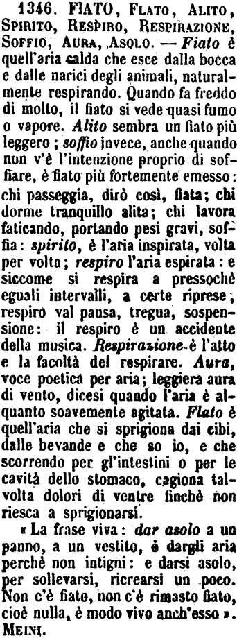 Fiato, Flato, Alito, Spirito, Respiro, Respirazione, Soffio, Aura, Asolo - Fiato è quell'aria calda che esce dalla bocca e dalle narici degli animali, naturalmente respirando. Quando fa freddo di molto, il fiato si vede quasi fumo o vapore. Alito sembra un fiato più leggero; soffio invece, anche quando non v'è l'intenzione proprio di soffiare, è fiato più fortemente emesso: chi passeggia, dirò così, fiata; chi dorme tranquillo alita; chi lavora faticando, portando pesi gravi, soffia: spirito, è l'aria inspirata, volta per volta; respiro l'aria espirata: e siccome si respira a pressochè eguali intervalli, a certe riprese, respiro val pausa, tregua, sospensione: il respiro è un accidente della musica. Respirazione è l'atto e la facoltà del respirare. Aura, voce poetica per aria; leggiera aura di vento, dicesi quando l'aria è alquanto soavemente agitata. Flato è quell'aria che si sprigiona dai cibi, dalle bevande e che so io, e che scorrendo per gl'intestini o per le cavità dello stomaco, cagiona talvolta dolori di ventre finchè non riesca a sprigionarsi.