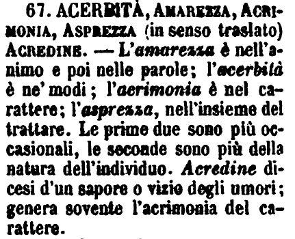 | Acerbità, Amarezza, Acrimonia, Asprezza (in senso traslato) Acredine - L'amarezza è nell'animo e poi nelle parole; l'acerbità è ne' modi; l'acrimonia è nel carattere; l'asprezza, nell'insieme del trattare. Le prime due sono più occasionali, le seconde sono più della natura dell'individuo. Acredine dicesi d'un sapore o vizio degli umori; genera sovente l'acrimonia del carattere. [immagine] |