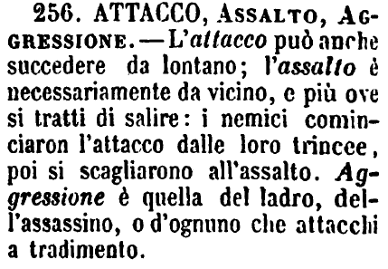| Attacco, Assalto, Aggressione - L'attacco può anche succedere da lontano; l'assalto è necessariamente da vicino, e più ove si tratti di salire: i nemici cominciaron l'attacco dalle loro trincee, poi si scagliarono all'assalto. Aggressione è quella del ladro, dell'assassino, o d'ognuno che attacchi a tradimento. [immagine] |