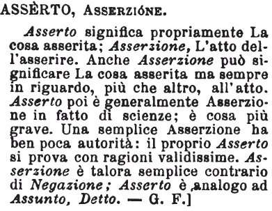 Asserto, Asserzione - Asserto significa propriamente La cosa asserita; Asserzione, L'atto dell'asserire. Anche Asserzione può significare La cosa asserita ma sempre in riguardo, più che altro, all'atto. Asserto poi è generalmente Asserzione in fatto di scienze; è cosa più grave. Una semplice Asserzione ha ben poca autorità: il proprio Asserto si prova con ragioni validissime. Asserzione è talora semplice contrario di Negazione; Asserto è analogo ad Assunto, Detto. - G. F.] [immagine]