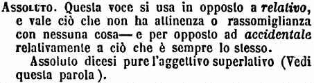 | Assoluto - Questa voce si usa in opposto a relativo, e vale ciò che non ha attinenza o rassomiglianza con nessuna cosa - e per opposto ad accidentale relativamente a ciò che è sempre lo stesso.