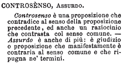 | Controsenso, Assurdo - Controsenso è una proposizione che contradice al senso della proposizione precedente, ed anche un raziocinio che contrasta col senso comune. - Assurdo è anche di più: è giudizio o proposizione che manifestamente è contraria al senso comune e che ripugna ne' termini. [immagine] |
