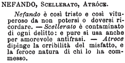 Nefando, Scellerato, Atroce - Nefando è così tristo e così vituperoso da non potersi o doversi ricordare. - Scellerato è contaminato di ogni delitto: e pure si usa anche per amorevole antifrasi. - Atroce dipinge la orribilità del misfatto e la feroce natura di chi lo ha commesso. [immagine]