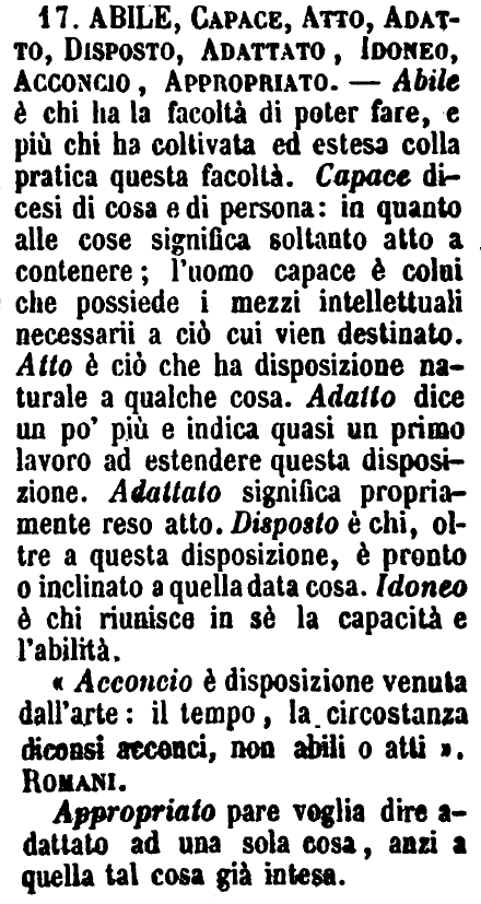 Abile, Capace, Atto, Adatto, Disposto, Adattato, Idoneo, Acconcio, Appropriato - Abile è chi ha la facoltà di poter fare, e più chi ha coltivata ed estesa colla pratica questa facoltà. Capace dicesi di cosa e di persona: in quanto alle cose significa soltanto atto a contenere; l'uomo capace è colui che possiede i mezzi intellettuali necessarii a ciò cui vien destinato. Atto è ciò che ha disposizione naturale a qualche cosa. Adatto dice un po' più e indica quasi un primo lavoro ad estendere questa disposizione. Adattato significa propriamente reso atto. Disposto è chi, oltre a questa disposizione, è pronto o inclinato a quella data cosa. Idoneo è chi riunisce in sè la capacità e l'abilità.