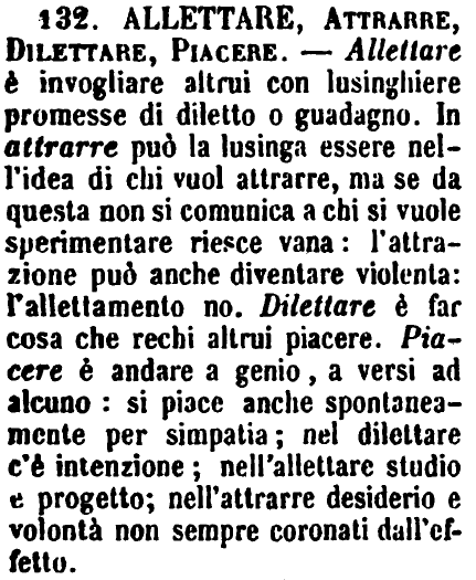 Allettare, Attrarre, Dilettare, Piacere - Allettare è invogliare altrui con lusinghiere promesse di diletto o guadagno. In attrarre può la lusinga essere nell'idea di chi vuol attrarre, ma se da questa non si comunica a chi si vuole sperimentare riesce vana: l'attrazione può anche diventare violenta: l'allettamento no. Dilettare è far cosa che rechi altrui piacere. Piacere è andare a genio, a versi ad alcuno: si piace anche spontaneamente per simpatia; nel dilettare c'è intenzione; nell'allettare studio e progetto; nell'attrarre desiderio e volontà non sempre coronati dall'effetto. [immagine]