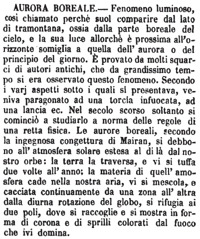 [G.M.] La campana dell'aurora (che si suona all'aurora). [G.M.] La Messa dell'aurora (che si celebra all'aurora, segnatam. nella notte del S. Natale). T. Quadrisillabo, in un sonetto d'uno del 500. Ma sempre trisillabo in D. (2. 2.) e ne Lat. 2. T. Personificata anche da chi non pensa alla favola antica. = Dant. Purg. 2. (C) Sicchè le bianche e le vermiglie guance, Là dov'io era, della bella Aurora, Per troppa etate divenivan rance. Bocc. g. 3. p. 1. L'aurora già di vermiglia cominciava, appressandosi il Sole, a divenir rancia. Petr. son. 183. Così mi sveglio a salutar l'Aurora. 3. T. Trasl. L'aurora della civiltà europea. – Della libertà. Giacomin. in Pros. fior. par. 1. v. 1. p. 107. ediz. fior. 1716. Quel figliuolo con tanto desiderio aspettato, con tanti prieghi e sospiri addimandato, con tanta letizia ricevuto, nella cui aurora lampeggiavano chiarissimi raggi di sublime virtù. 4. Per quello Spazio di tempo che dura l'aurora. Bocc. Filoc. l. 4. p. 216. (Gh.) Così freschi come rugiadosa rosa colta nell'aurora. Belc. Vit. Colomb. C. 304. (Man.) A un altro tempo un giovane d'assai e onorevole d'aspetto, venne una mattina in su l'aurora, e battè la porta. 5. Per estens. T. But. Com. Purg. 9. 1. L'aurora della luna. Così interpreta il passo di Dante; che, secondo lui, non cade dell'aurora del dì. Ma per estens., siccome diciamo aurora boreale, ogni principio di splendore, che poi crescerà, potrebbesi dire Aurora. 6. Per Oriente. Tass. Ger. 3. 38. (M.) E già domi sarebbono i più australi Regni, e i regni più prossimi all'aurora. E 17. 16. Secondan quei, che posti in ver l'aurora, Nella costa asïatica albergaro. Car. Eneid. 9. 163. Indi un gran nembo Di Coribanti per lo ciel trascorse Di ver l'aurora; ed una voce udissi, Ch'empiè di meraviglia e di spavento L'uno esercito e l'altro. 7. (Meteor.) [Gher.] Aurora boreale od australe. Fenomeno di luminosa accensione celeste, accompagnata da archi e da irraggiamenti di vivida luce, bianca, rossa e violetta, che sembra sollevarsi poco sull'orizzonte, dalla parte dell'uno o dell'altro polo, e talvolta distendesi perfino allo zenit dell'osservatore ed anco al di là. Dimostra la stretta attinenza col magnetismo terrestre, e colla elettricità degli spazi celesti. [Cont.] G. G. Sag. Che talora si facciano sublimazioni fuor del consueto della materia dei crepuscoli, l'esemplifica per quella boreale aurora. 8. T. de' Tíntori. Sorte di giallo. |