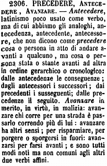 | Precedere, Antecedere, Avanzare - Antecedere, latinismo poco usato come verbo, ma di cui abbiamo gli analoghi, antecedenza, antecedente, antecessore, che non dicono come precedere cosa o persona in atto di andare avanti a qualcuno, ma cosa o persona stata o stante avanti ad altra in ordine gerarchico o cronologico: dalle antecedenze le conseguenze; dagli antecessori i successori; dai precedenti i susseguenti; dalle precedenze il seguito. Avanzare in merito, in virtù, in malizia: avanzare chi corre per una strada è passarlo correndo più di lui: avanzare ha altri sensi; per risparmiare, per porgere o sporgersi in fuori: avanzarsi per farsi avanti; e sono tutti modi noti ma non comuni agli altri due verbi affini. [immagine] |