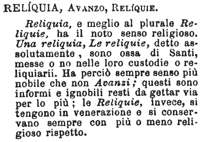 | Reliquia, Avanzo, Reliquie - Reliquia, e meglio al plurale Reliquie, ha il noto senso religioso. Una reliquia, Le reliquie, detto assolutamente, sono ossa di Santi, messe o no nelle loro custodie o reliquiarii. Ha perciò sempre senso più nobile che non Avanzi; questi sono informi e ignobili resti da gettar via per lo più; le Reliquie, invece, si tengono in venerazione e si conservano sempre con più o meno religioso rispetto. [immagine] |