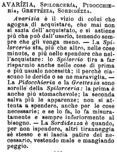 Avarizia, Spilorceria, Pidocchieria, Grettezza, Sordidezza - Avarizia è il vizio di colui che agogna di acquistare, che mai non si sazia dell'acquistato, e si astiene più che può dall'usarlo, temendo sempre che gli venga meno. - La Spilorceria sta, più che altro, nelle cose minute, e più nello spendere che nell'acquistare: lo Spilorcio tira a far risparmio anche nelle cose di prima e più usuale necessità; il perché ciascuno lo deride o se ne maraviglia. - La Pidocchieria e la Grettezza sono sorelle della Spilorceria: la prima è anche più stomachevole; la seconda salva più le apparenze; non si attenta a spendere, anche per le cose necessarie; e se lo fa, lo fa misuratamente e sempre inferiormente al bisogno. - La Sordidezza è quando, per non ispendere, altri tiranneggia sè stesso e si lascia patire del necessario, vestendo male e mangiando peggio. [immagine]