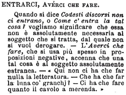 | Entrarci, Averci che fare - Quando si dice Codesti discorsi non ci entrano, o Come c'entra la tal cosa? vogliamo significare che essa non è assolutamente necessaria al soggetto che si tratta, dal quale non si vuol derogare. - L'Averci che fare, che si usa più spesso in proposizioni negative, accenna che una tal cosa è al soggetto assolutamente estranea. - «Qui non ci ha che far nulla la letteratura. - Che ha che far la luna co' granchj? - Ci ha che fare quanto il cavolo a merenda.» [immagine] |