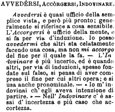 | Avvedersi, Accorgersi, Addarsi - «Avvedersi è più facile, più istantaneo, più estrinseco: nell'accorgersi entra più il raziocinio o il sentimento; e poichè v'ha luogo induzione, perciò può aver luogo l'errore. Addarsi s'approssima di senso all'apporsi: vale a dire che esprime un accorgersi, quasi per indovinamento, non per indizii certi». Tommaseo. [immagine] |
