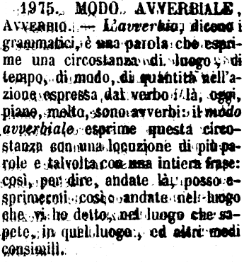 Modo Avverbiale, Avverbio - L'avverbio, dicono i grammatici, è una parola che esprime una circostanza di luogo, di tempo, di modo, di quantità nell'azione espressa dal verbo: là, oggi, piano, molto, sono avverbi: il modo avverbiale esprime questa circostanza con una locuzione di più parole e talvolta con una intiera frase: così, per dire, andate là, posso esprimermi così: andate nel luogo che vi ho detto, nel luogo che sapete, in quel luogo, ed altri modi consimili. [immagine]