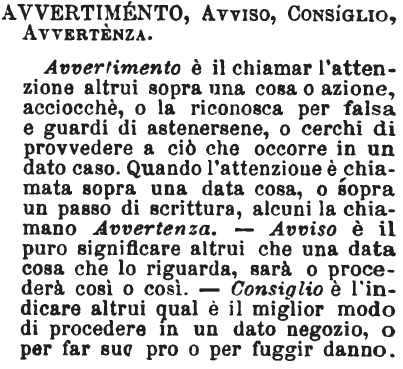 | Avvertimento, Avviso, Consiglio, Avvertenza - Avvertimento è il chiamar l'attenzione altrui sopra una cosa o azione, acciocchè, o la riconosca per falsa e guardi di astenersene, o cerchi di provvedere a ciò che occorre in un dato caso. Quando l'attenzione è chiamata sopra una data cosa, o sopra un passo di scrittura, alcuni la chiamano Avvertenza. - Avviso è il puro significare altrui che una data cosa che lo riguarda, sarà o procederà così o così. - Consiglio è l'indicare altrui qual è il miglior modo di procedere in un dato negozio, o per far suo pro o per fuggir danno. [immagine] |